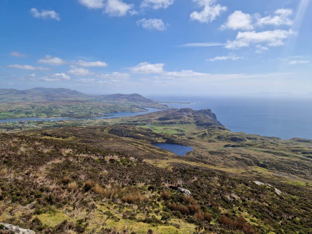 We began our weekend trip by heading toward County Donegal in the northwest of the island. While searching for beautiful nature spots here, we discovered the “Seven Sisters” located in the Derryveagh Mountains. They consist of seven beautiful hills, the most famous of which is Errigal, reaching 751 meters. The other peaks are Mackoght (551m), Aghla More (581m), Ardloughnabrackbaddy (603m), Aghla Beg (564m), Crocknalaragagh (471m), and Muckish (666m). Together, these peaks form one of the most scenic 21km routes—the Seven Sisters Skyline.