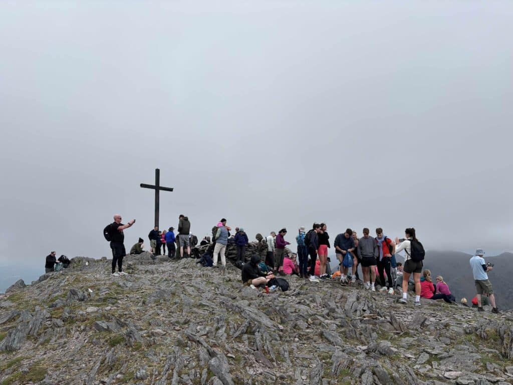Having started our trek quite late, we climbed the Devil’s Ladder alone. However, once we topped out onto the ridge, we saw a crowd reminiscent of a busy beach resort! The mountain is truly popular. The third stage to the summit, marked by a cross, followed a wide path up the slope.