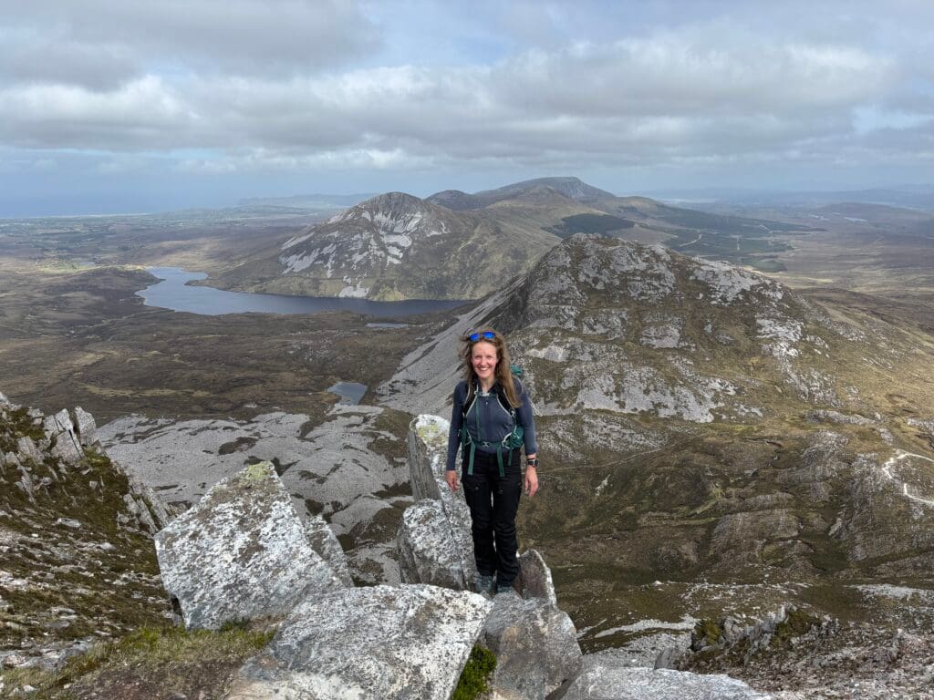 Initially, we planned to run across all seven peaks, but due to logistical challenges (the route is not a loop), we decided to climb one and see how we felt. We chose the most beautiful—Errigal. We left the car in the parking lot near the mountain, swapped into our hiking boots, and set off. The trail is very easy and well-marked, so we ascended quickly. The higher we climbed, the more spectacular the views became. The summit itself proved to be incredibly photogenic!