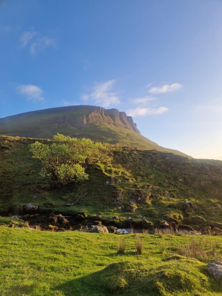We arrived at Benbulbin in the evening since we had visited Sliabh Liag earlier that day. We parked in the free parking lot near the mountain. Before we started gaining elevation, we had to cross a long meadow with several boggy patches. Because of this, I highly recommend waterproof hiking boots for this trek. I had read mixed reviews about the route, especially that the trail can become very slippery in the rain. However, the day turned out dry and beautiful for us, so we climbed quickly and enjoyed the unfolding expanses. Both the mountain and the climb were a fun adventure, and the views from the top were simply breathtaking!