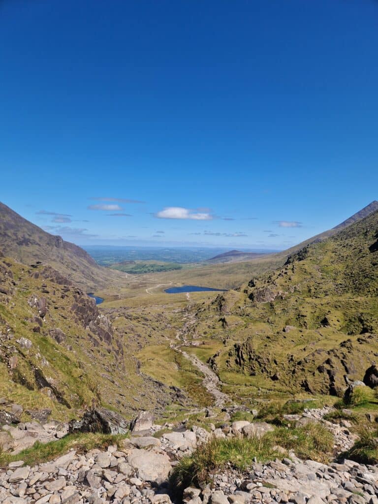 The first stage of the hike leads through Hag’s Glen (Raganos slėnis). The path winds through green meadows and past small lakes, gradually gaining height. The views in the valley are impressive—the mountains aren’t massive in height, but their vibrant green is a treat for the eyes.