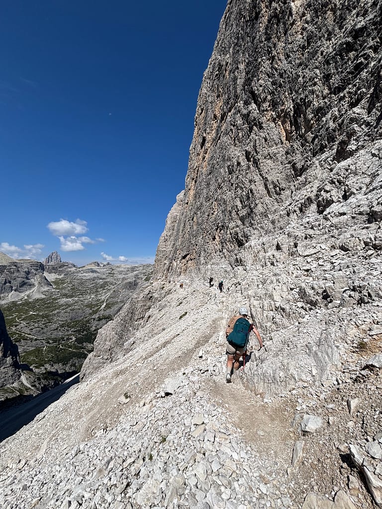 The approach to Rifugio Zsigmondy Comici is around ⏱ 3 hours and takes you 📈 750 meters up. It’s a significant elevation gain so I was happy to have a hut to stop at and get some snacks and a macchiato! The abundance of huts it one of the reasons why I love traveling in Italy. The view from the hut is amazing with Croda dei Toni mountain in all it’s glory. On top of that I got to say hi to few donkeys who were wandering around the hut. As I learned later on, Rifugio Zsigmondy Comici still relies on traditional “transport” and some of the supplies are brought up by animals, like the donkeys I saw.